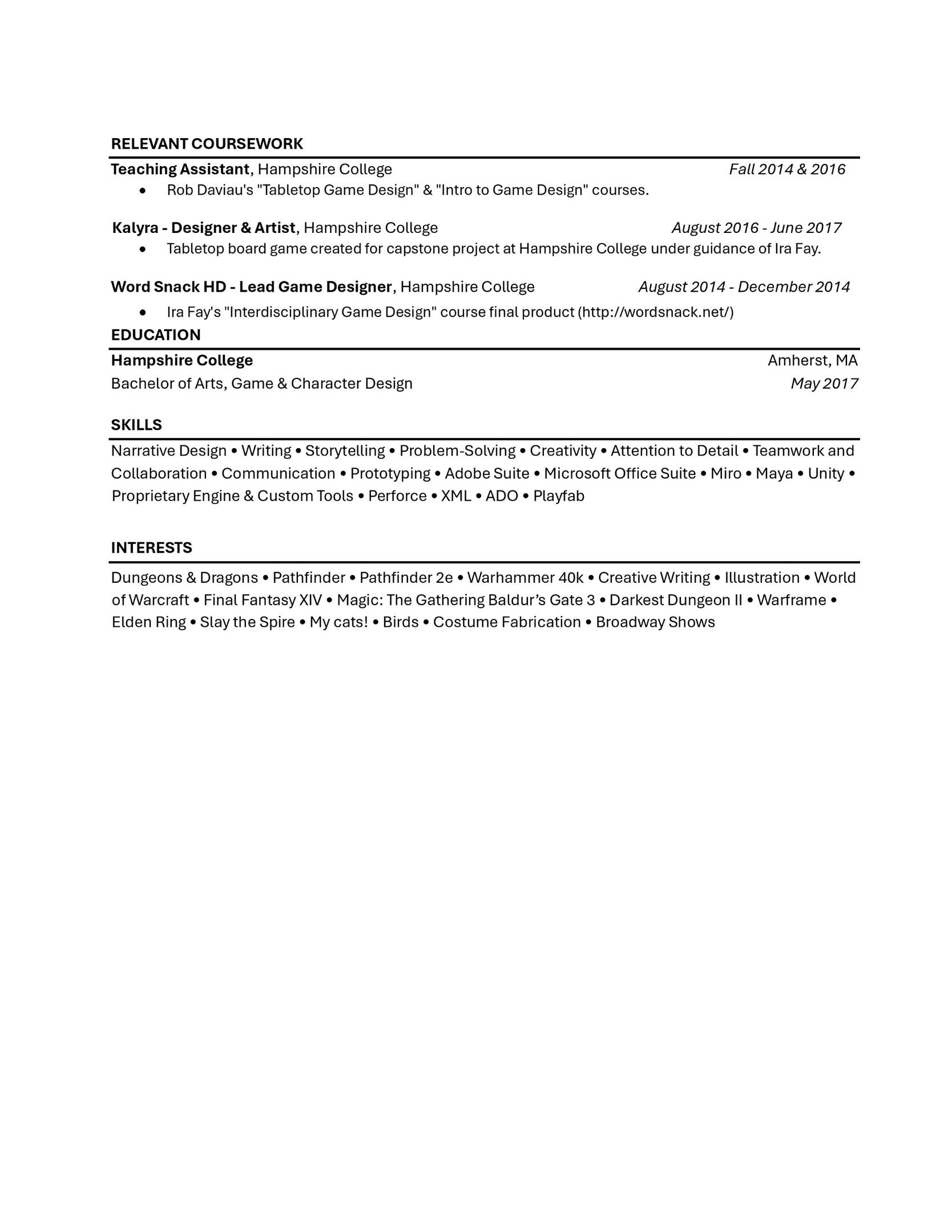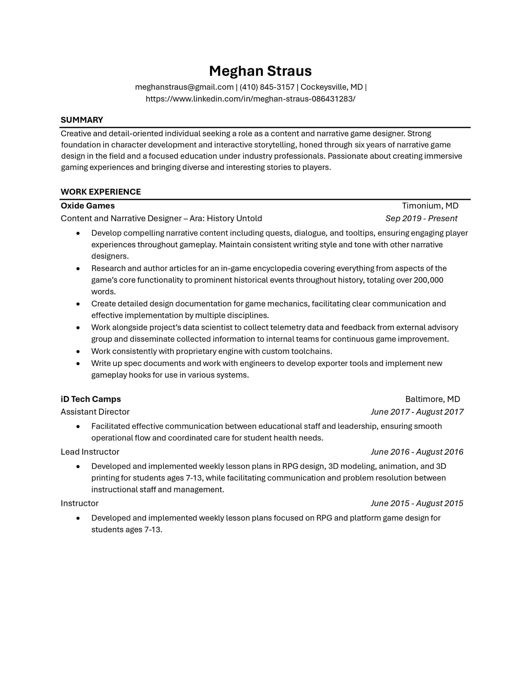 My name is Meghan Straus, and I'm a Narrative and Content Designer with 6+ years of experience in the gaming industry. I've worked on everything from AAA games alongside industry veterans to school projects with talented peers.If you want more detailed information about my exact responsibilities on various projects, please check out my resume by clicking the button above.